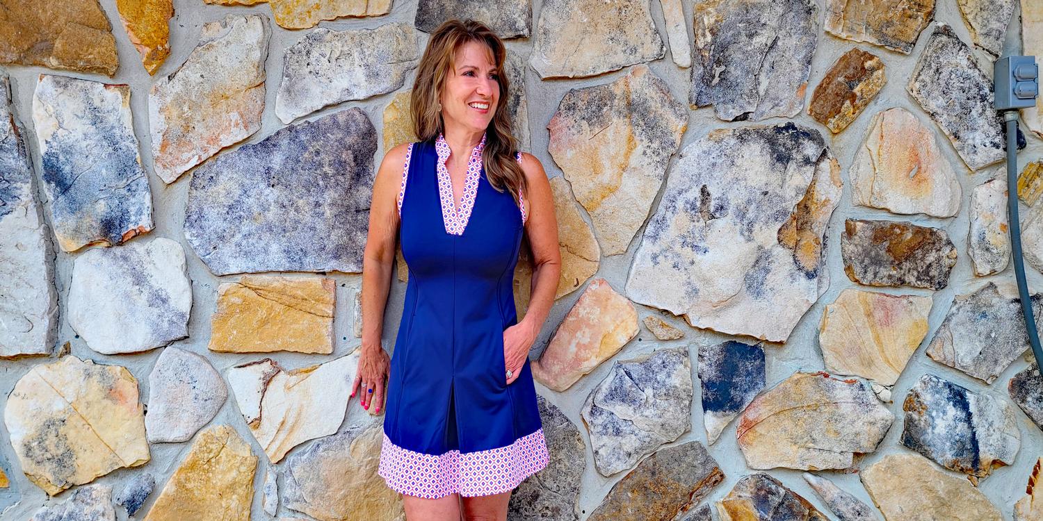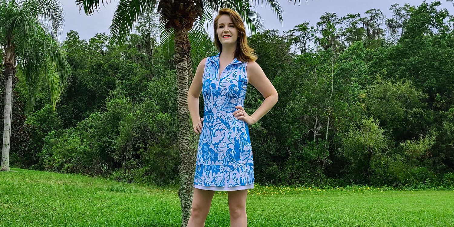 KINONA's Swing and Swish Sleeveless Golf Dress is the perfect dress for just about anything; a day on the course, drinks at the 19th hole, or whatever else the club has to offer! It's flattering, fun, and flirty. The Swing and Swish Sleeveless Dress features UPF 50+ sun protection and a 4-way stretch to get you completely through your golf swing without any pinching or binding. The zippered placket lets you decide how much sun you get. The dress comes with mesh undershorts with leg grippers, two on-seam pockets to help keep your golf balls and markers in place, as well as built-in tee holders. The Swing and Swish Sleeveless Golf Dress is available in Navy Blue, while the Swing and Swish Skort is available in the Mediterranean Floral print as well.